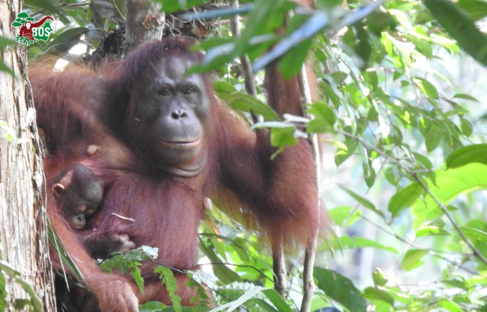 Efforts to monitor orangutans in the wild have once again delivered heartening news. Our Post-Release Monitoring (PRM) Team recently encountered a female orangutan strongly believed to be Agis, a rehabilitated individual from the Borneo Orangutan Survival Foundation (BOS Foundation) who was released into Bukit Baka Bukit Raya National Park (TNBBBR) in 2018. Even more encouraging, Agis was observed carrying an infant orangutan estimated to be around 6–8 months old.